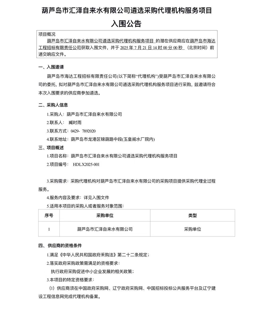 葫蘆島市匯澤自來水有限公司遴選采購代理機(jī)構(gòu)服務(wù)項(xiàng)目 入圍公告