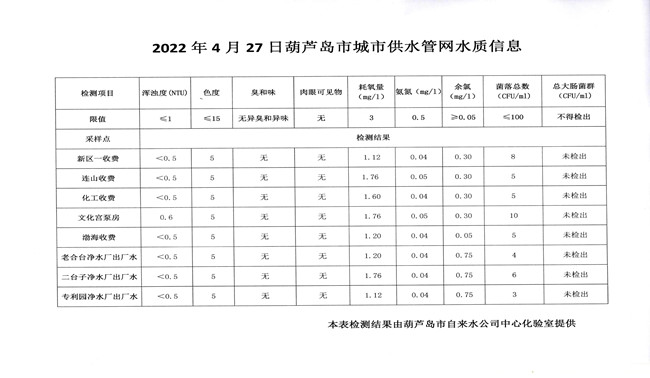 2022年4月27日葫蘆島市城市供水管網水質信息