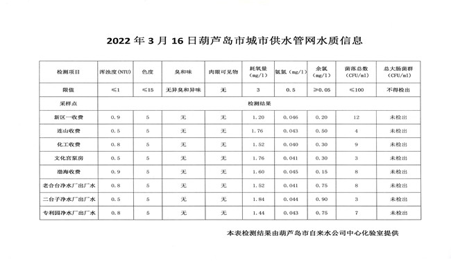 2022年3月16日葫蘆島市城市供水管網(wǎng)水質信息