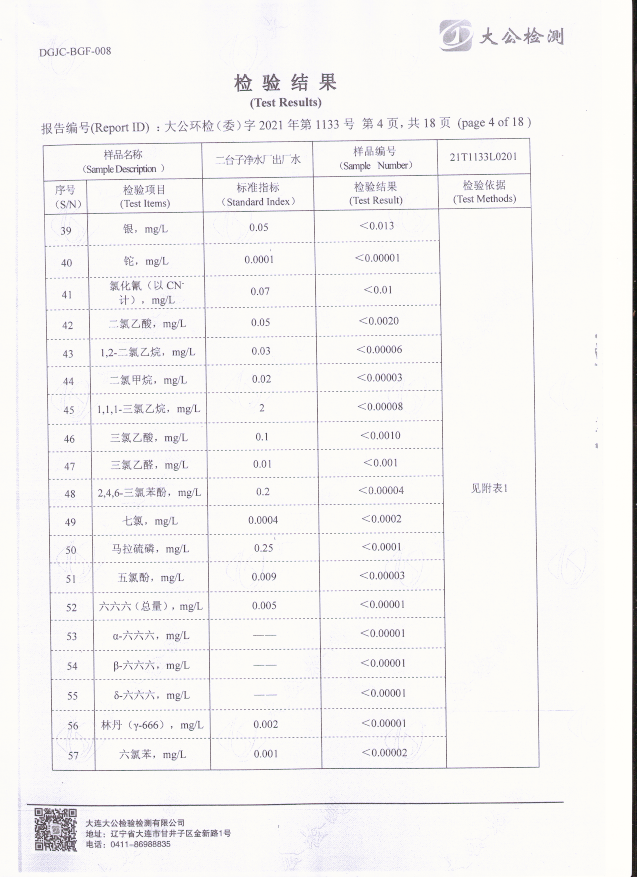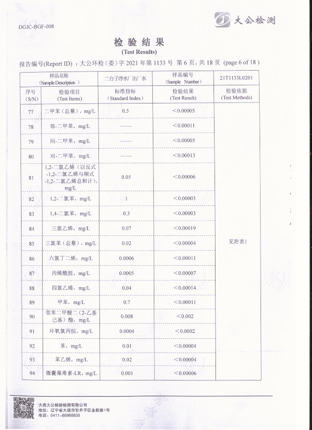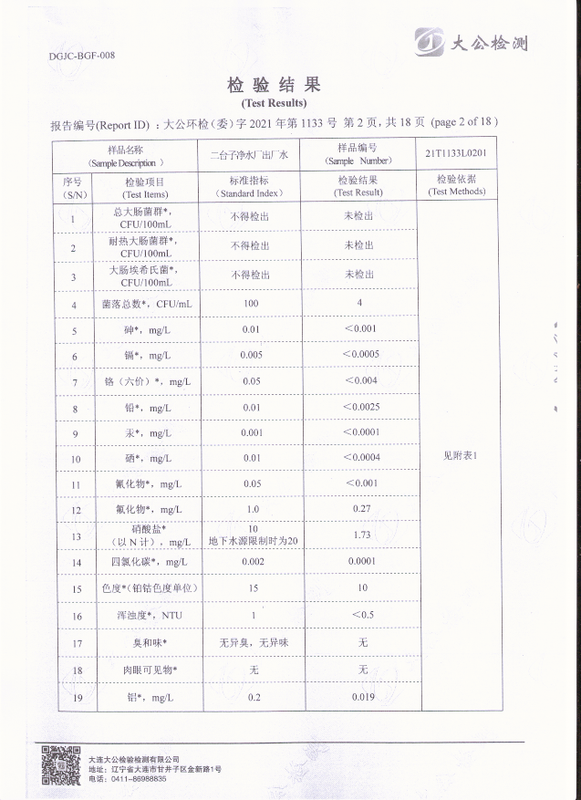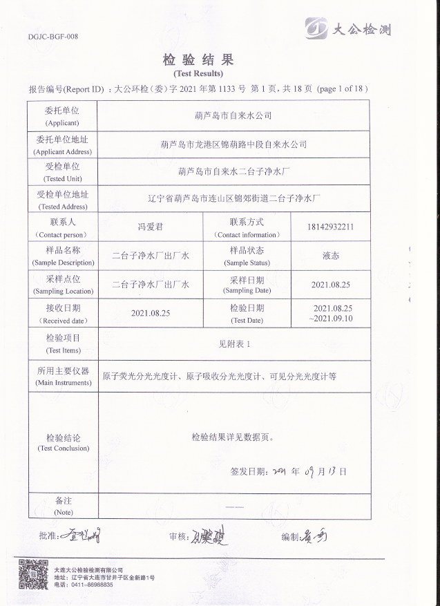 二臺(tái)子凈水廠出廠水檢驗(yàn)報(bào)告