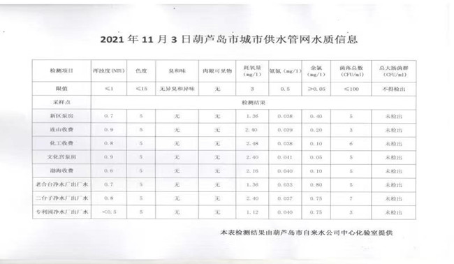 2021年11月3日葫蘆島市城市供水管網(wǎng)水質信息