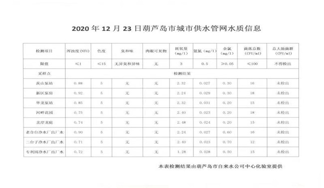 2020年12月23日葫蘆島市城市供水管網(wǎng)水質(zhì)信息