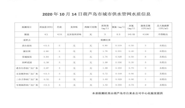 2020年10月14日葫蘆島市城市供水管網(wǎng)水質(zhì)信息