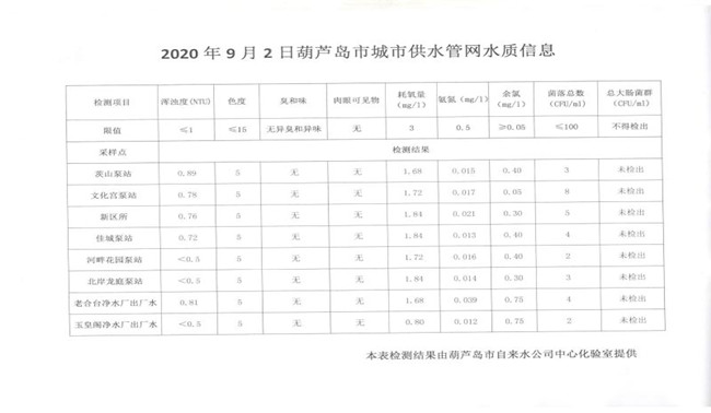 2020年9月2日葫蘆島市城市供水管網(wǎng)水質信息