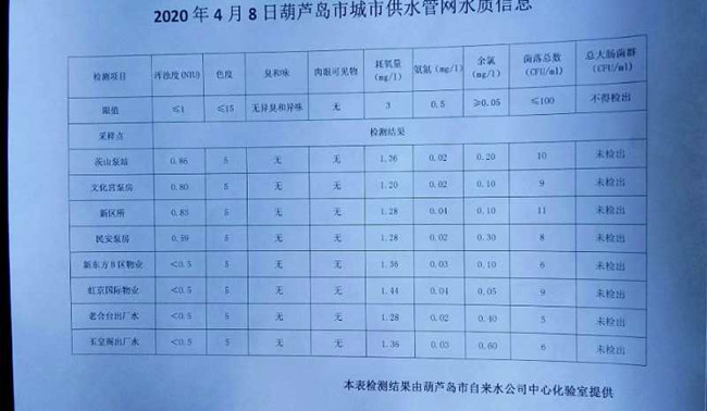 2020年4月8日葫蘆島市城市供水管網水質信息
