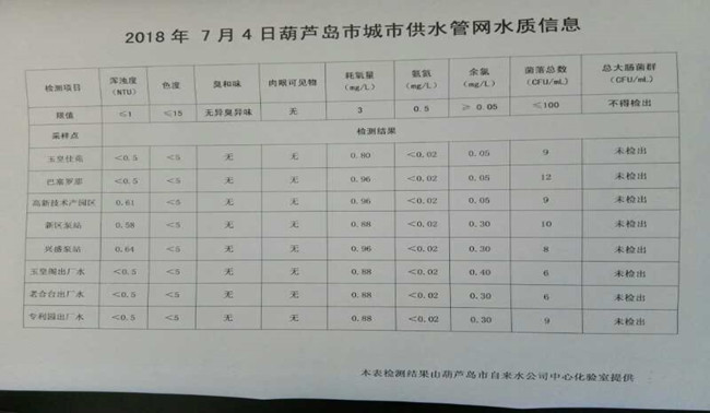2018年7月4日葫蘆島市城市供水管網(wǎng)水質(zhì)信息