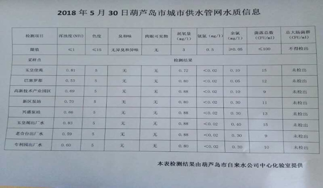 2018年5月30日葫蘆島市城市供水管網(wǎng)水質(zhì)信息